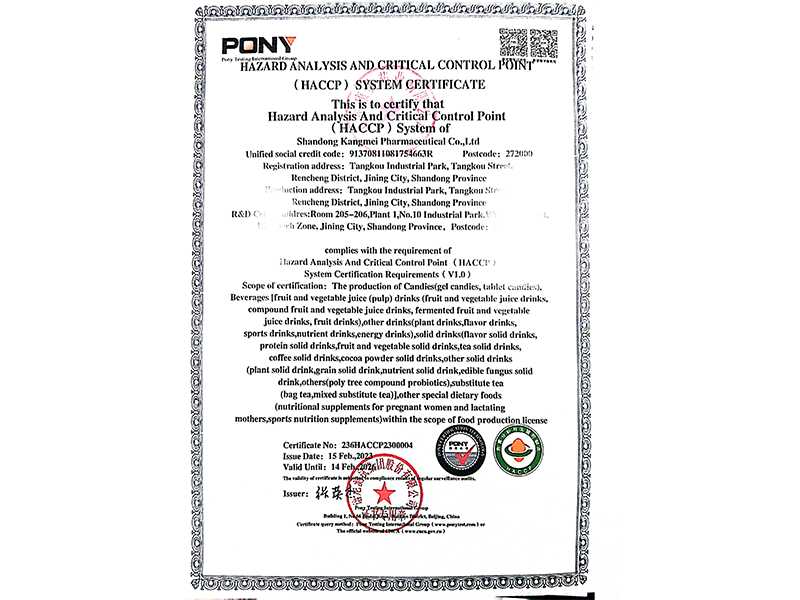 危害分析與關(guān)鍵控制點體系認(rèn)證證書
